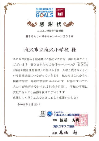 最近は年賀状をやり取りする文化も減少してきていると言われています。滝沢小学校でも全校から集まった「書き損じはがき」の枚数はそんなに多くはないのですが,役立ててほしいという思いを込めて,ボランティア委員会の委員長からユネスコ協会の方にお渡しをしました。