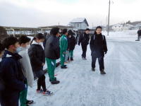 | 2月19日(木),今年度最後の「JUあいさつ運動」を滝沢中学校入り口で行いました。ここ数日間暖かい日が続いていましたが、この日は朝から小雪が舞い、春一番と思われるような風も吹く中で、小学校は児童会執行部と応援委員会が、中学校は生徒会執行部と2学年委員会が、寒さに負けずに元気なあいさつを響かせました。 |